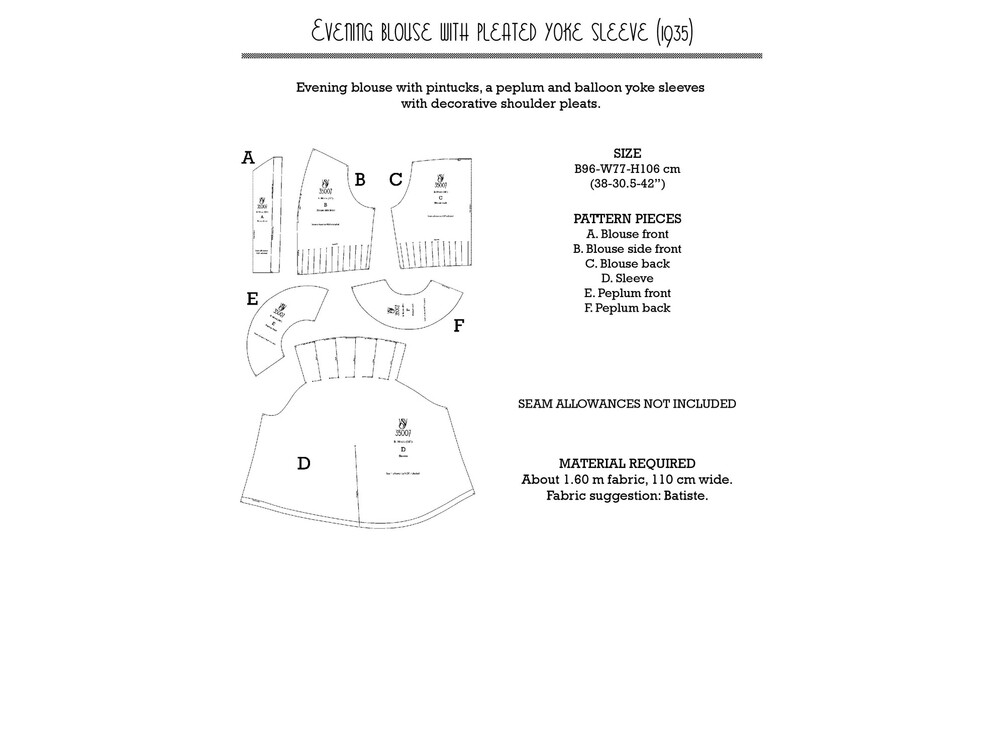 1930's Evening blouse with pleated yoke sleeves (B38" - 96 cm) [VSV 35007]. You will receive 3 PDF files for printing both at home on A4/Letter sized tiled pages and full sized A0 sheets for print shops.